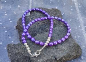 Halsband av sötvattenspärlor i en mörk lila färg och glittrande silverpärlor. Priset avser 1 st.