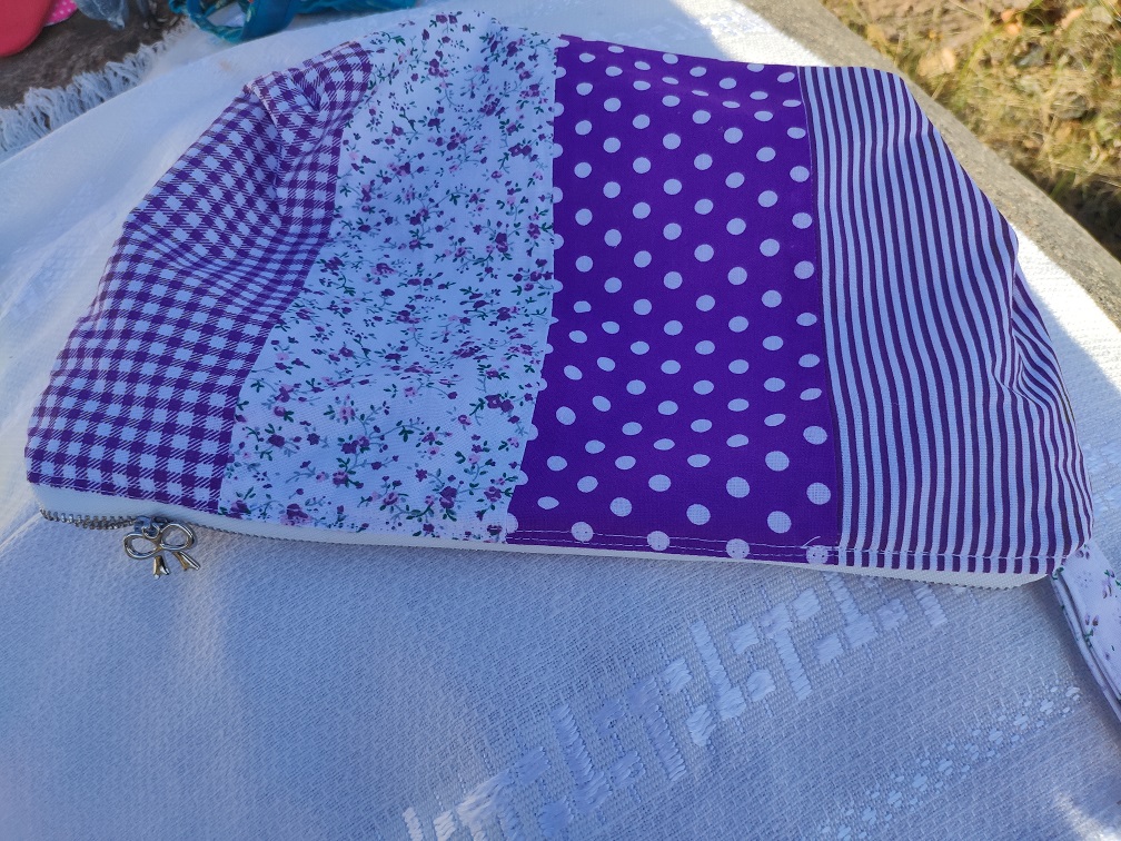 En fin nesescär i vackra lila toner med dragkedja och ett litet hänge med kristaller!